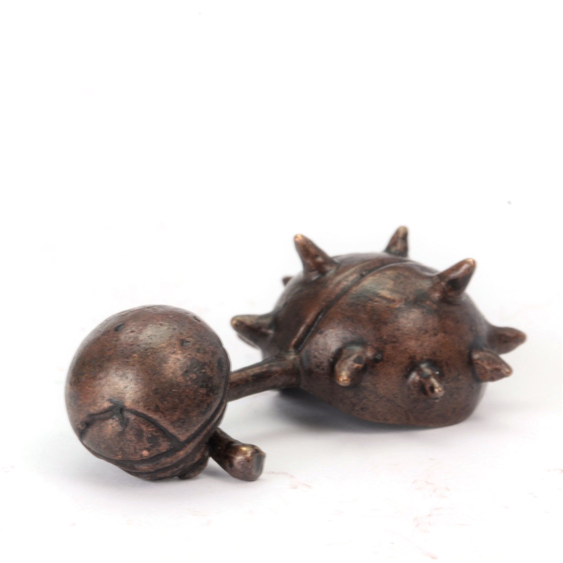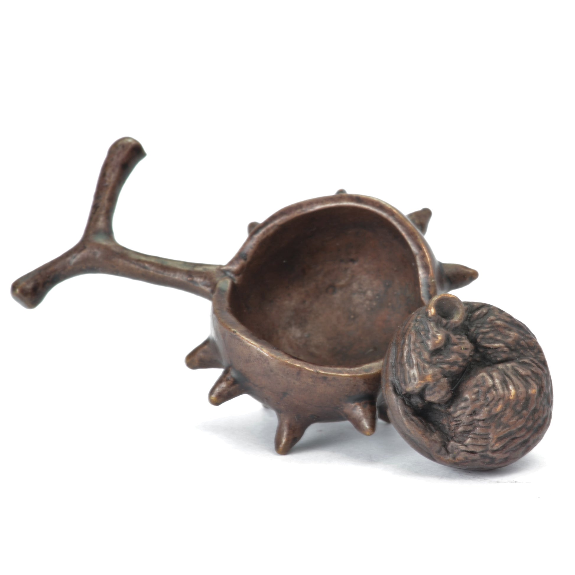A teeny, tiny little mouse sleeping inside an empty horse chestnut shell. Please do study the pictures carefully, especially the ones with hands/fingers in. This really is the TINIEST little rodent I've ever seen sculpted and hot cast in solid bronze.