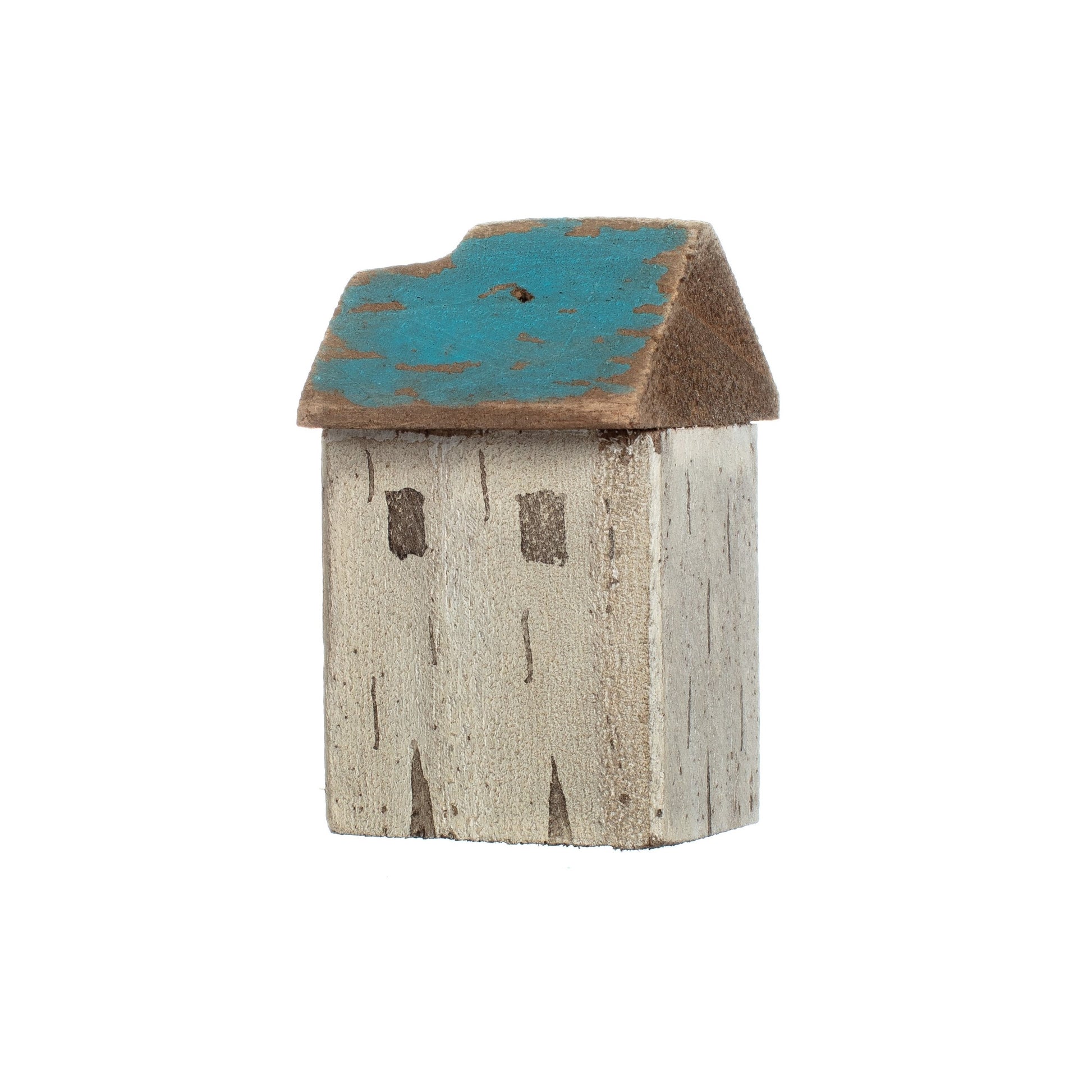 This super tiny, sweet wooden cottage is a charming, rustic-style shelf decoration, white with a blue roof to complement any decor.