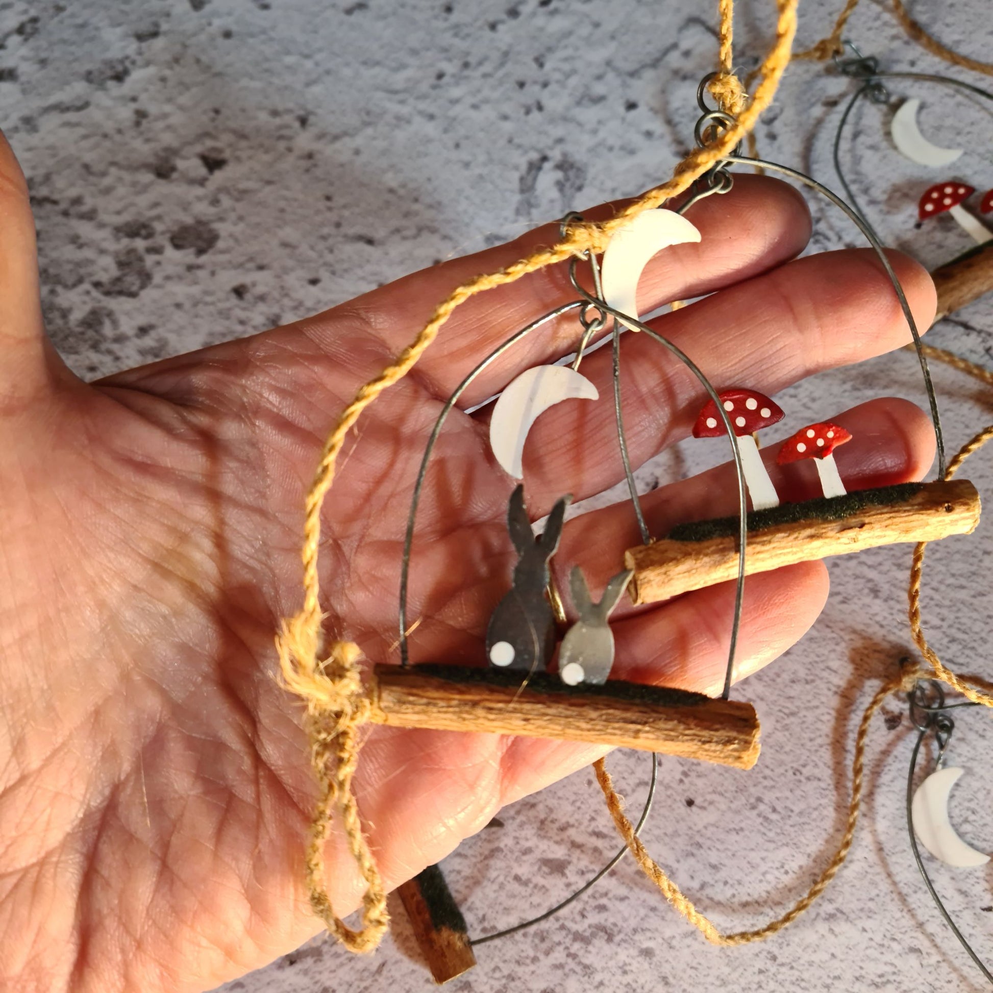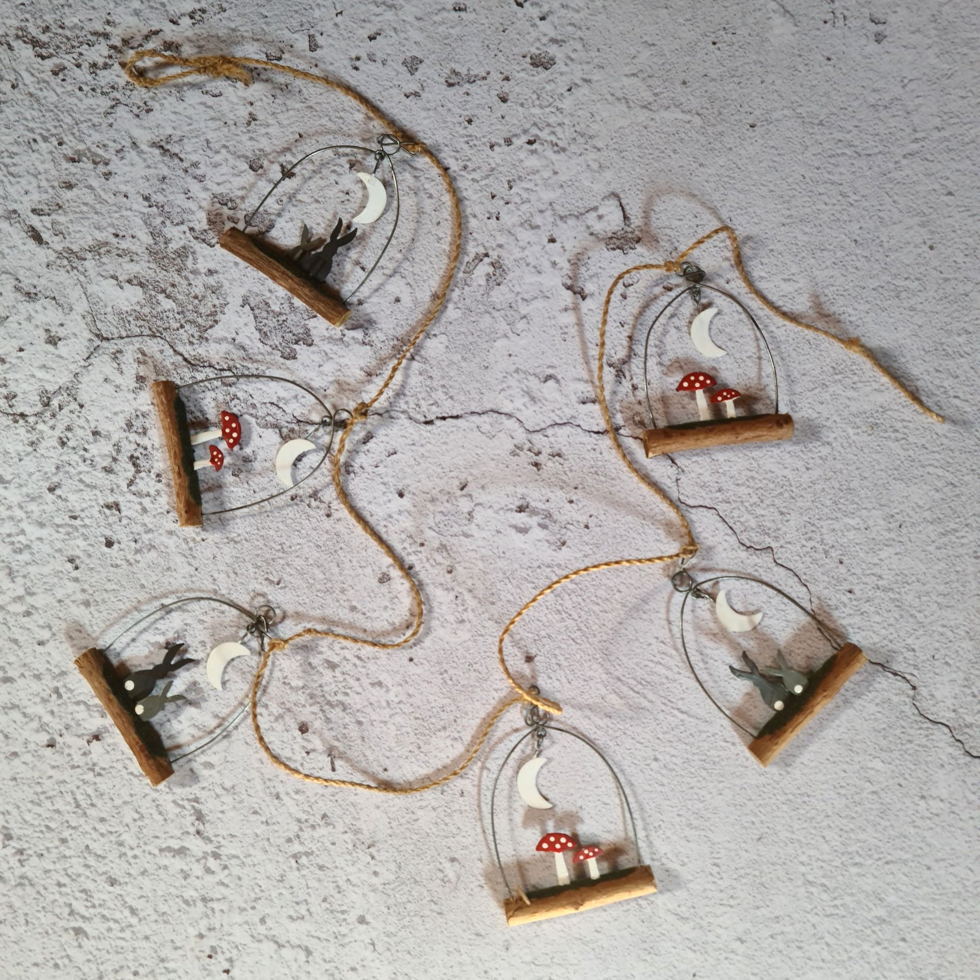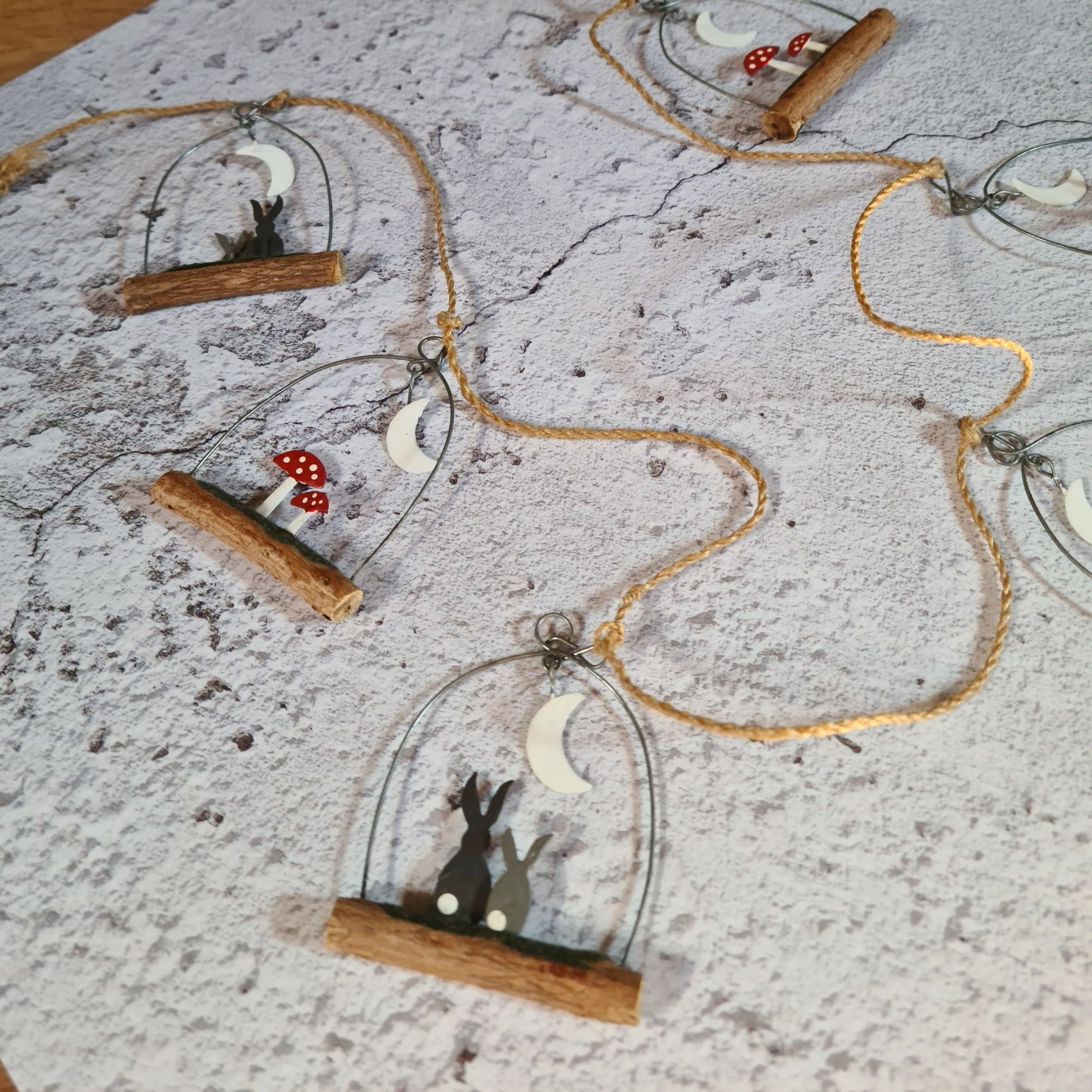A rustic hanging garland with three rabbit figures and three toadstools strung beneath a crescent moon. The kind of thing that looks good draped along a mantlepiece, hung above a bed, or looped over a hook in a child's room.