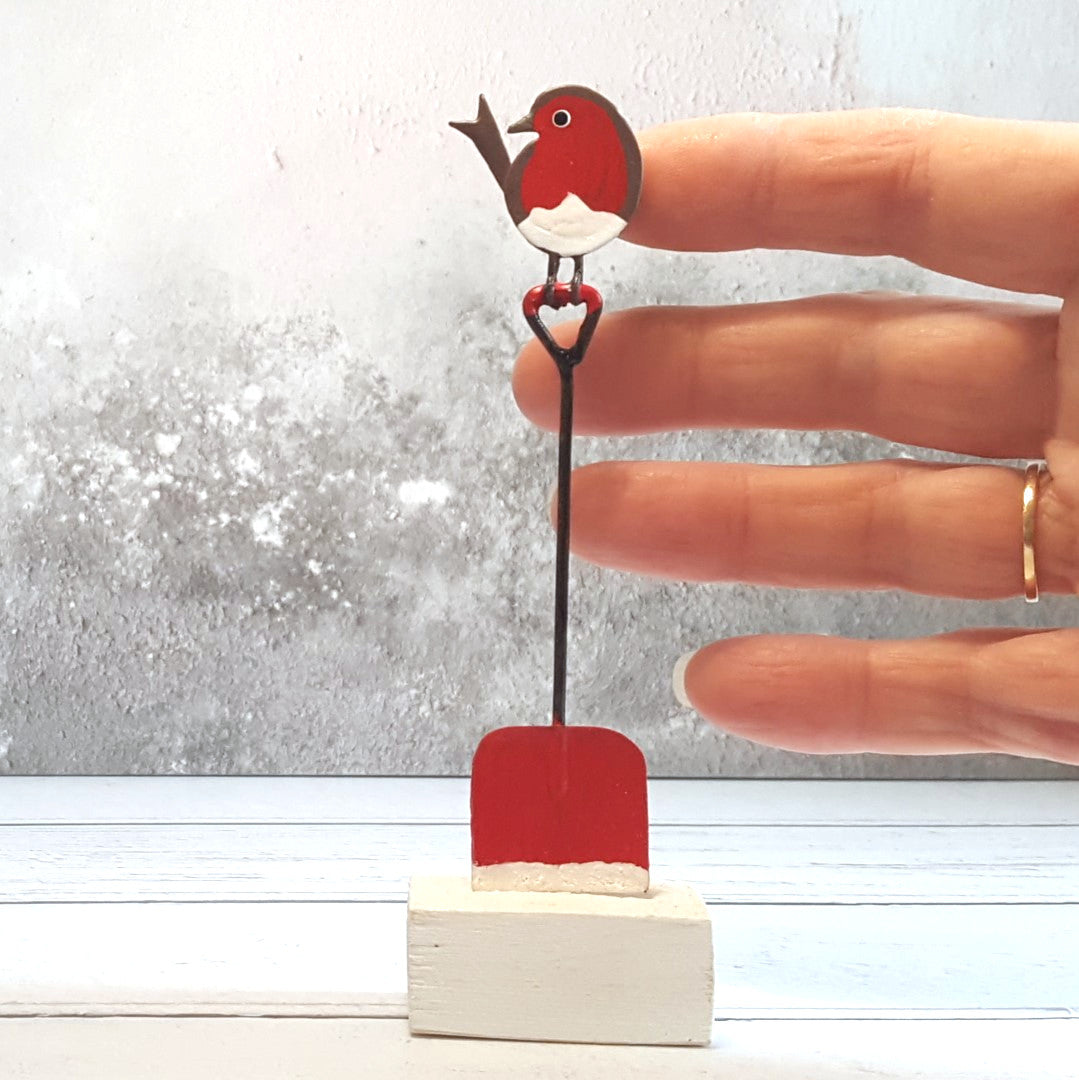 Add a touch of festive charm to your home with this beautifully crafted Robin on Spade shelf decoration. The little robin is made of painted metal and mounted on a wooden block. This Christmas-themed piece is a must-have for the holiday season.