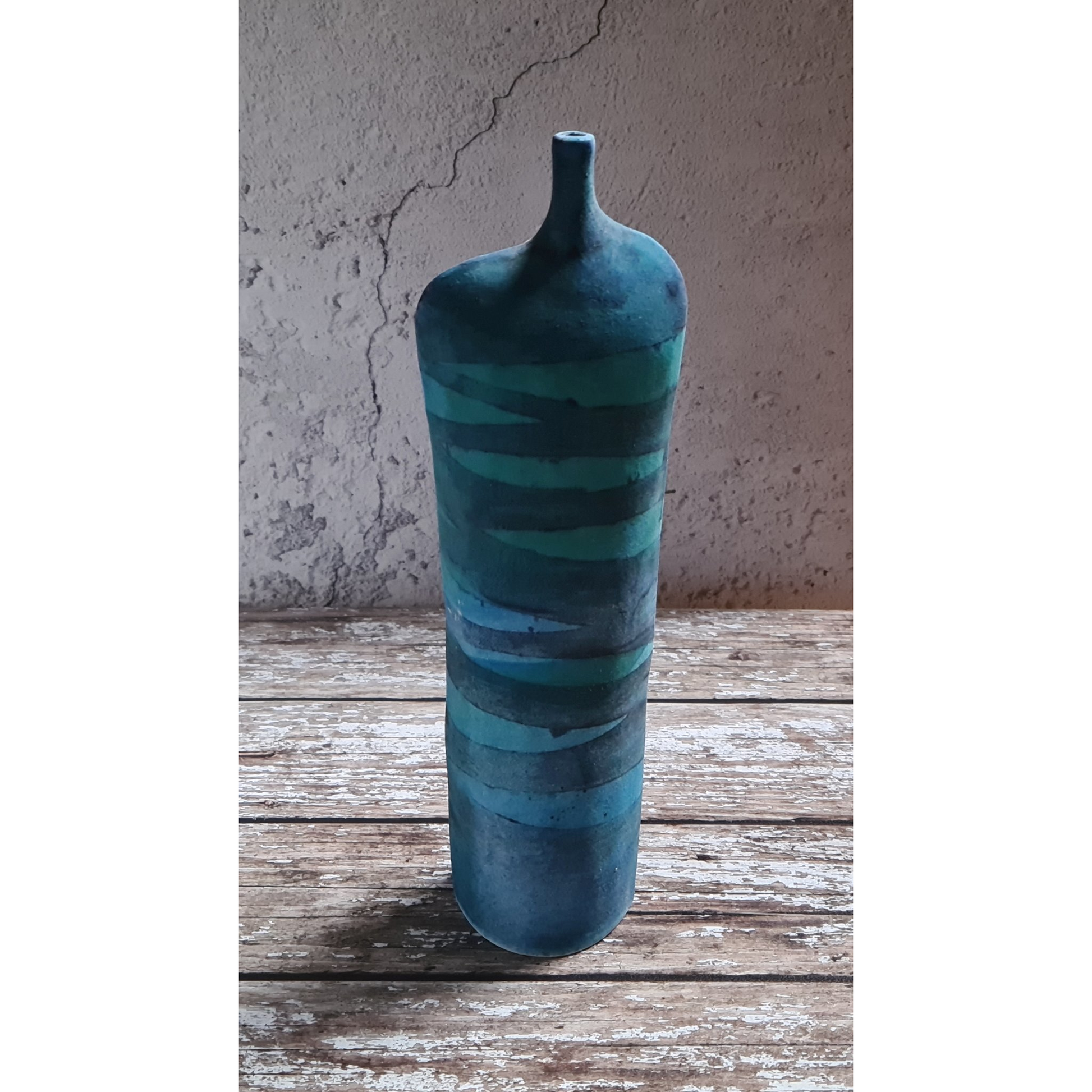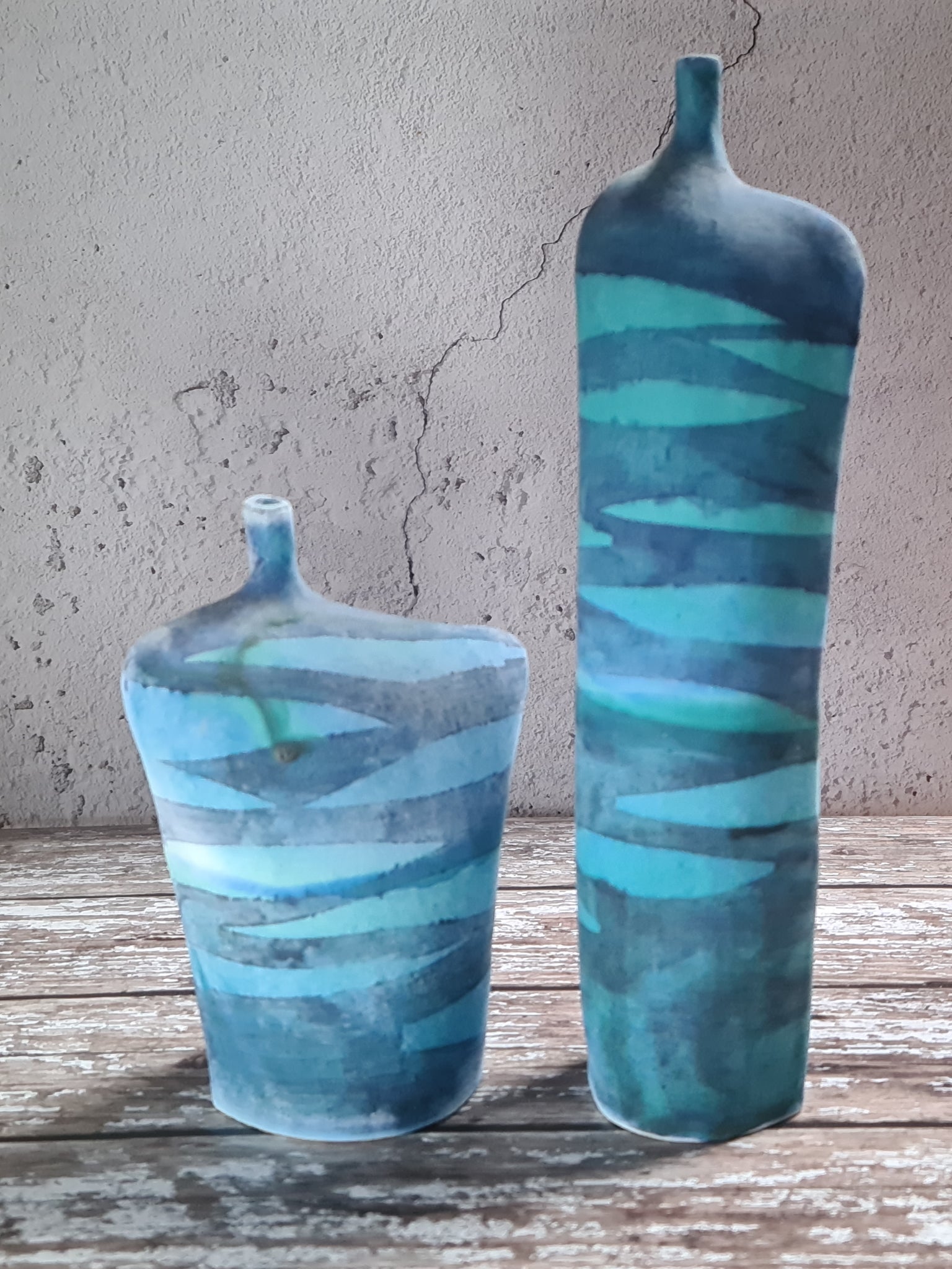 Kirsti's hand-built slab bottles have an almost human-like presence. Narrow necks on well-defined shoulders draw the eye down to slip, glazes, patterns and textures reminiscent of ancient pots and historical rock carvings. The colours of the glazes are a nod to the oftentimes dramatic weather and skies of Wales and Scotland.